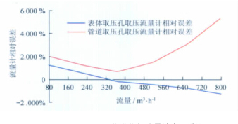 從以上數據表和曲線圖中可以看出:空氣流量計型號一定的情況下,用表體取壓孔取壓方式檢定流量計時流量計的線性度較好,用管道取壓孔取壓方式檢定流量計時流量計的線性度較差;流量測點相同的情況下,表體取壓孔取壓檢定方式的流量計誤差較小,管道取壓孔取壓檢定方式的流量計誤差較大;兩種取壓方式引起的誤差隨著流量的增大而逐漸增大,在流量為2 900m3/h時兩者相差近6.2%,遠遠超出了流量計的準確度等級。所以,在空氣流量計的檢定過程中,應避免在流量計表體取壓孔以外的地方取壓進行檢定。
